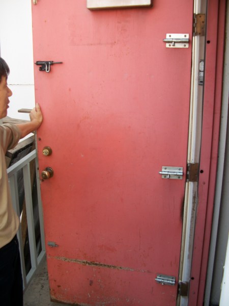 Outward swinging metal doors can be defeated numerous different ways with the irons. The door we see below is showing our typical key in the knob lock with the common deadbolt above it. We also see a latch guard has been installed and a set of two small bolts higher up to door that could be a smaller gauge secondary lock.  This picture is a door where I have heard people say go straight to the saw and the hinges. My personal belief is that an irons team with a game plan and solid irons work will defeat this far before a saw will.