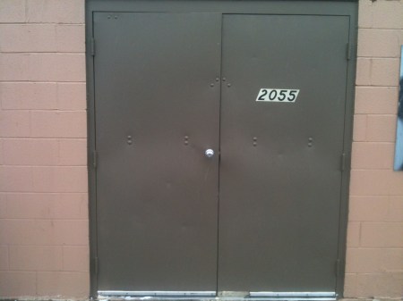 This door is on the backside of a single story “L” shaped strip mall.  The store is used as an army surplus outlet.  Run down the key size up points and see what you think. The double doors are set in masonry construction.  What else do we see?