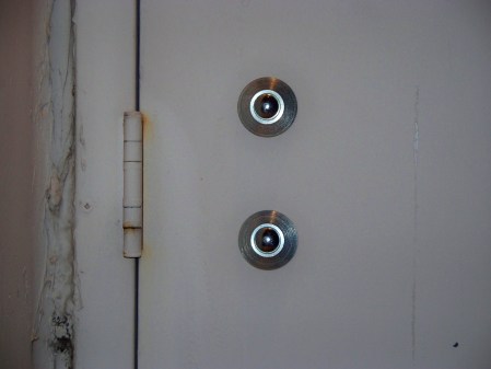 From the outside these doors will have a bolt pattern that presents like most drop bar mounts. The big difference when you look close is the types of washers they use. This is the easiest way for us to identify the system from the outside and puts us one step ahead when trying to determine what we are going up against. These washers are not flat but raise slightly off of the door and then have a recessed area for the heads of the carriage bolts to fit in. They are polished and have a very obvious look to them that they are commercially produced and not just something that was picked up from the hardware store. The angle that is created by the raised washers make the saw blades want to walk compared to the rough edge of a normal washer. The washers are also very large and this makes driving them through the door very difficult.