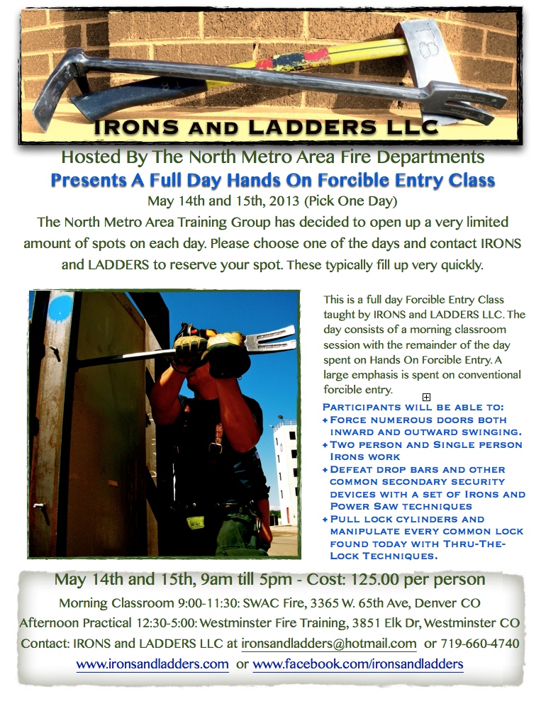 The North Denver Metro Area Training Officers have decided to open a limited amount of spots on the two days of forcible entry classes that they are hosting. Pick either the 14th or the 15th and contact us today to register a spot, these are already filling up very quickly and we have very limited spots left on each day. This will probably be the last Denver Metro area class this year. Click on the flyer for more information and contact information to register. Thanks