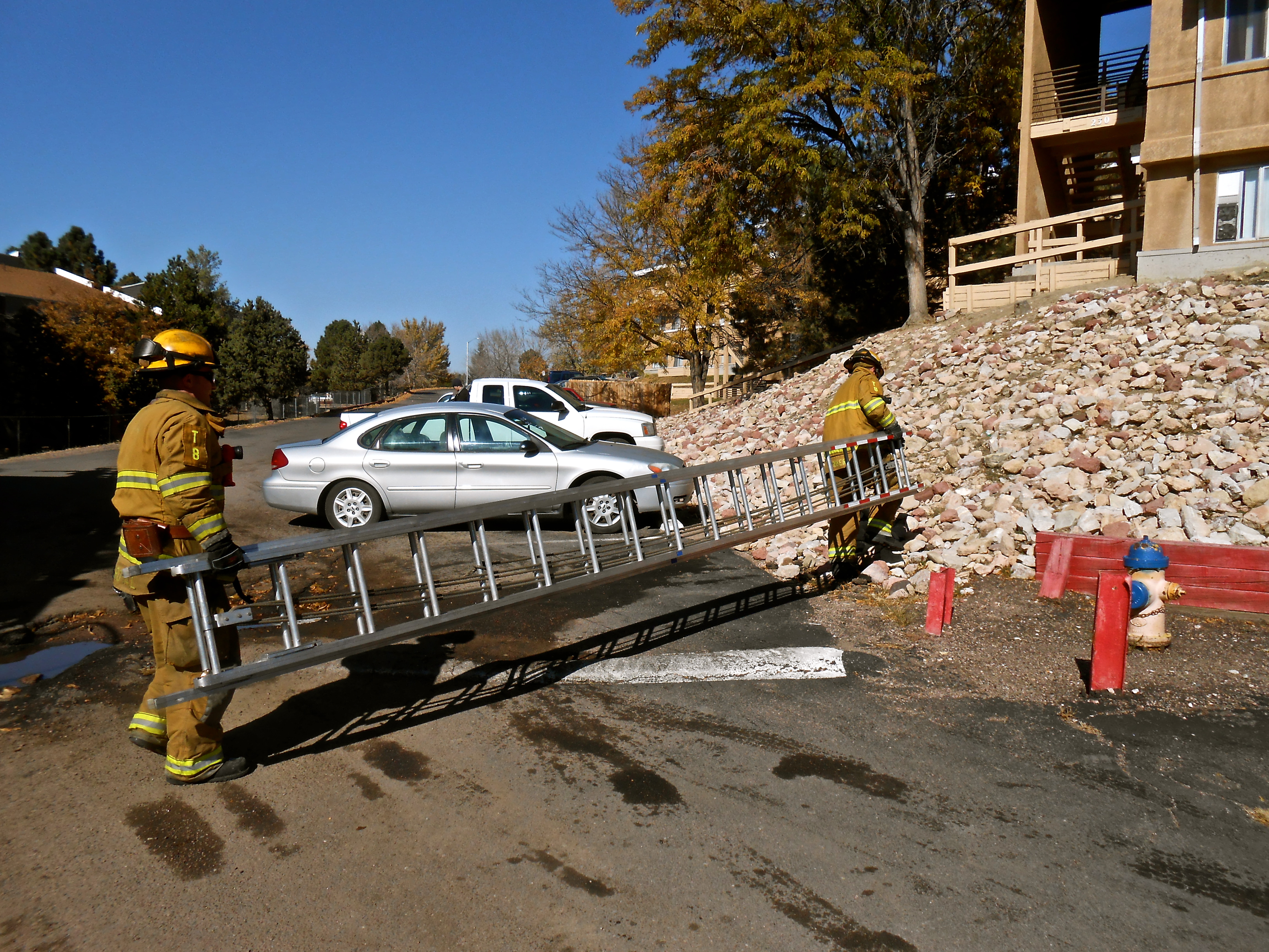 We have had good luck with this, but it is not a throw I would want to try for the first time when it is actually needed on a fire scene. I highly recommend spending some time on this beforehand so you can have some extra control on your hands until it feels fine tuned. This building we are practicing at had a multi alarm fire years ago that required numerous ladder rescues of occupants by the first in Truck Co’s. It was not over this rock bed, but was right next door and very close to being a very realistic scenario.