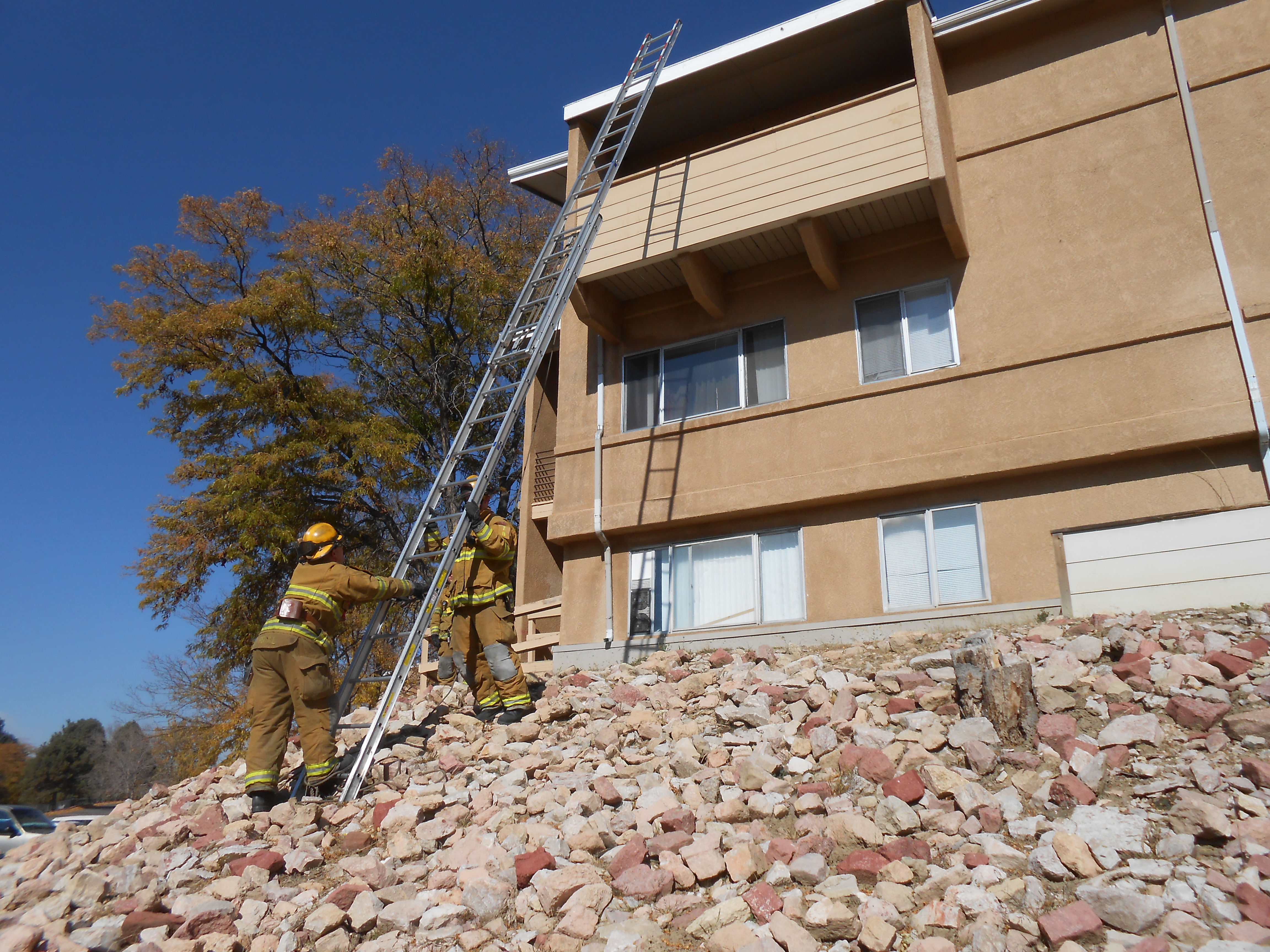 Below is one of the main advantages of this type of raise. The firefighter on the uphill side has good leverage and control as he raises the ladder. If you tried to approach this building and raise the ladder in a traditional flat or beam raise from the bottom of the hill up, you would either run out of reach above your head, possibly run out of strength, and risk a much higher chance of dropping the ladder back down. This also keeps your ladder in the right position so you do not have to rotate it while freestanding in this rock bed or on a hillside.