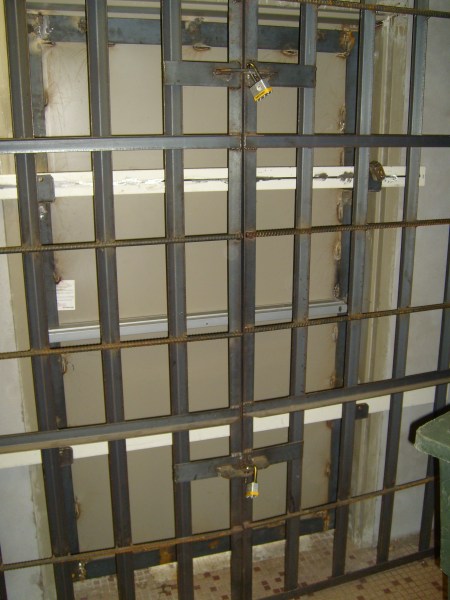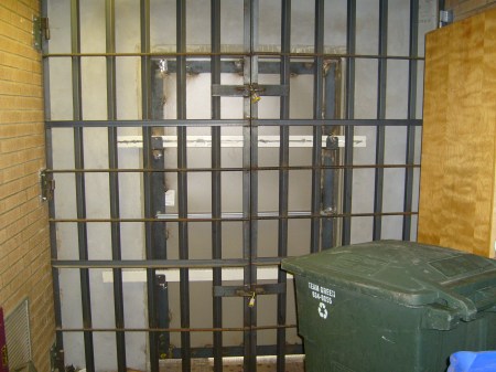 - The carriage bolt pattern suggests an additional locking device has been added. The likelihood is small that this is a drop bar because of the unusual pattern of the carriage bolts. However, in our haste to access this door we may mistake this for a drop bar. Another note about the carriage bolts is the size of the washers behind them. This will add difficulty in driving the carriage bolts through the door should we choose to employ that tactic.