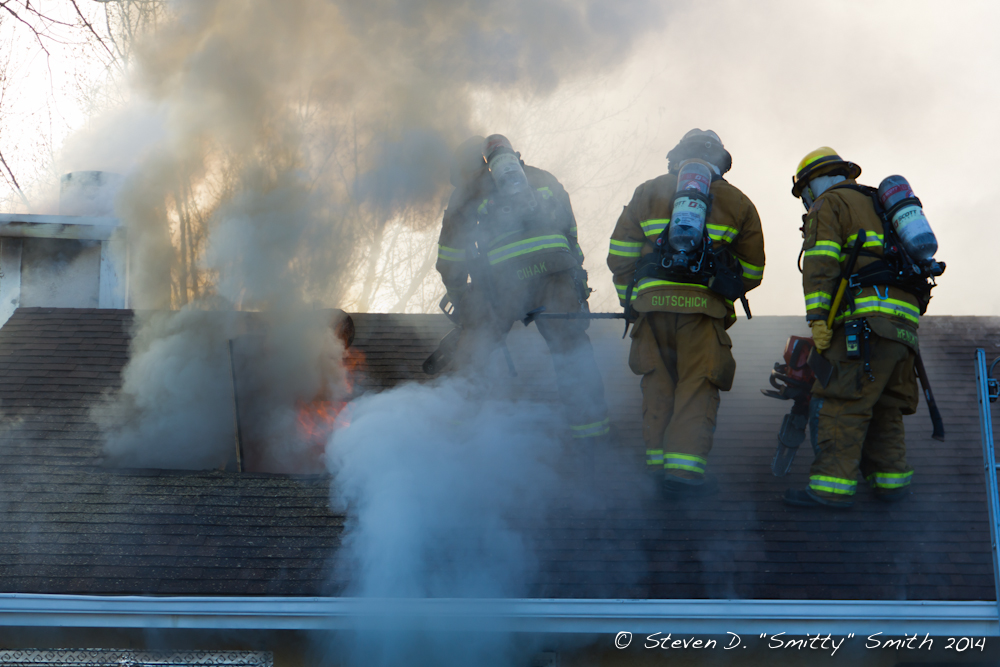 03/23/2014(Note: Brian Brush and myself were having a discussion early this morning about these photos. They are some of the better photos I have seen in a long time showing vertical ventilation in coordination with an interior attack. Rarely do we get photos that give you an accurate look of the building upon arrival, as the lines are being stretched, the hole being cut, the smoke lifting and the vent hole igniting, and then wrapping it up with a great photo as the engine makes a hit on the fire. We both thought it was worthy of discussion and definitely photos worth sharing with everyone for their own vertical vent training. I provided Brian with the photos and some of the on scene tactics and he put the article together for us. Thanks Brush! – Ryan Royal)