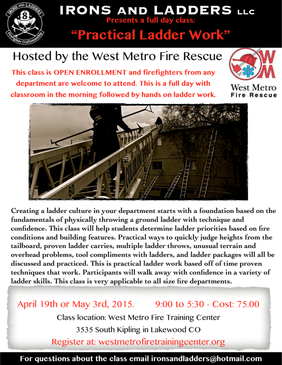 These are the first two hands on ground ladder classes we are opening to firefighters from any department. We have been working on the development of this class for a while now and have finally started booking dates around Colorado. The flyer has the class description and registration information. Sign up soon at the lowest price we can offer for this class. Our host site is West Metro Fire in Lakewood CO.