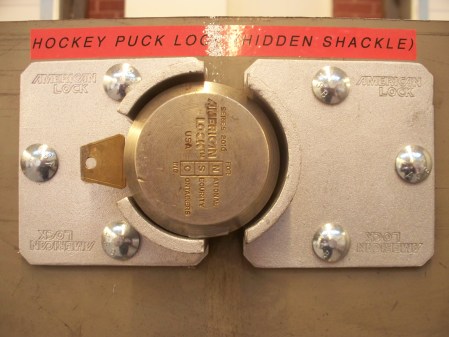 You can see we have a typical door knob telling us that we do not have a panic bar setup. We also have a commercial deadbolt with a shackle guard which can slow us down getting a proper gap close to the bolt. In addition we have carriage bolts indicating drop bar mounts. These appear from the outside to be significant having four 3/8 inch carriage bolts for each mount. Fairly significant security, but nothing that an aggressive set of irons can’t defeat.