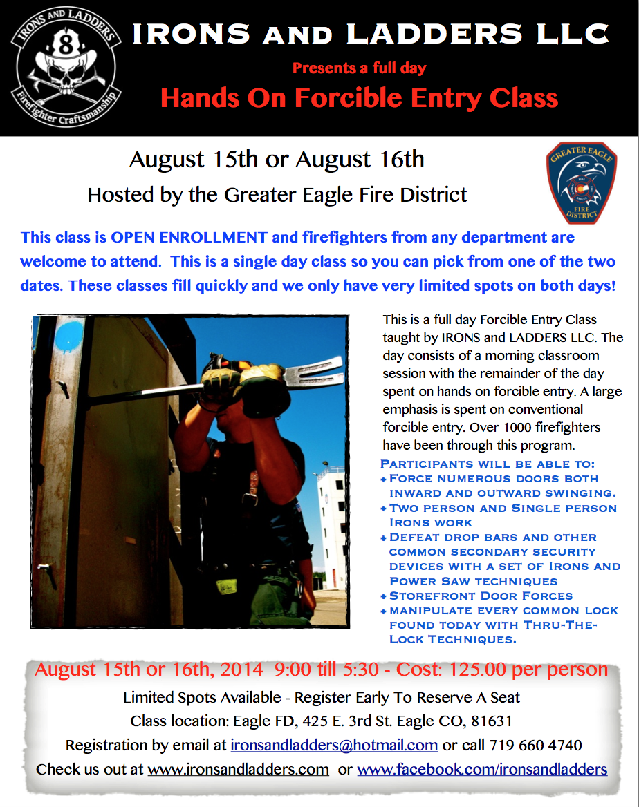 05/20/2010We have some spots remaining for the May 30th Hands On Forcible Entry Class. This is an open enrollment class and firefighters from any department are welcome to attend. To register please email ironsandladders@hotmail.com, or call 719 660 4740. Time is running out so contact us soon. Click on the flyer below for more information.
