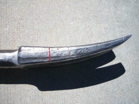 The first mark we have added is on the Adze end. This mark has been scratched in at about 1 3/4. This is the standard width of commonly found doors, by making this mark it will assist us in knowing when the adze is about to hit the jamb on outward swinging doors. This can assist us in navigating the Adze around the back of the door and not tearing into the jamb. It also can prevent us from stopping to shallow and then tearing the skin and seam of the door when we start to make our gap.