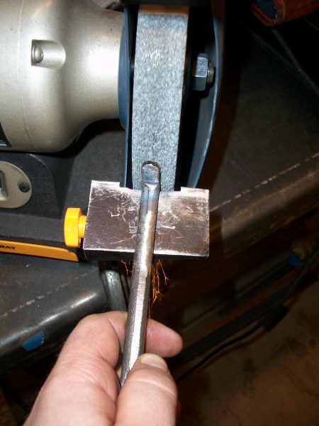 Next I like to take the two ends and grind them roughly into shape, make sure you don’t go to thin because it is easier to clean them up and fine tune them with the angle grinder. It is hard to describe the size you want to make these end pieces, look closely at the next pictures for a design, but more importantly trying them in some common locks to make sure they fit all of them is important. I will do my best to give you some dimensions and the reasoning behind it.