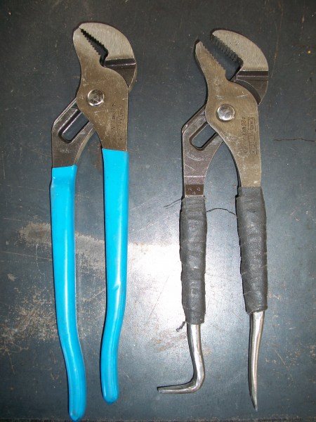 Above is a before and after picture of the pliers we are going to make. I only use the # 420 Channellock Brand 9 1/2 inch slip joint pliers. It makes a difference to spend the 12 bucks and buy the quality brand pliers that will last forever. They are made with quality steel and do not use a nut to hold together the handles. After you get your pliers we start our process by cutting off the blue rubber handles with a utility knife .